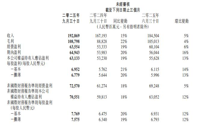 从核心财务数据来看,腾讯三季度展现出强劲的增长势头。报告期内,公司实现营收1928.7亿元,同比增长15%;同期Non-IFRS净利润725.7亿元,同比增长18%;毛利率同比提升3个百分点至56%,三项关键指标均实现两位数增长,且利润增速持续高于营收增速,反映出公司收入结构不断优化,盈利质量显著提升。